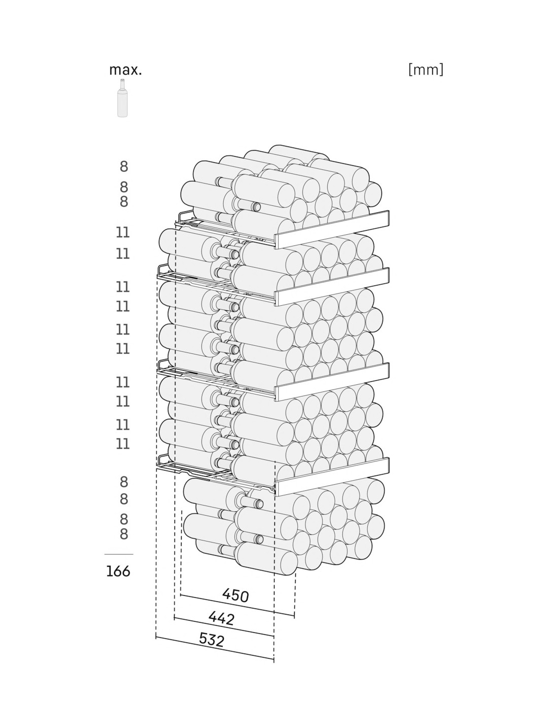 Stockage des bouteilles avec des clayette métallique avec façade en bois réglables en hauteur.