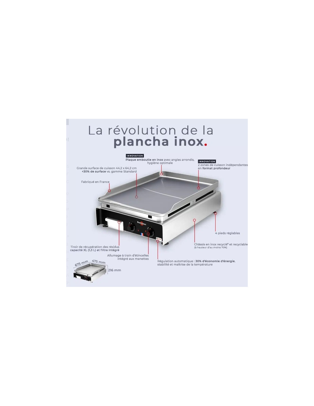 Deux plaques de cuissons indépendantes, qui permettent une réactivité rapide aux changements de températures.